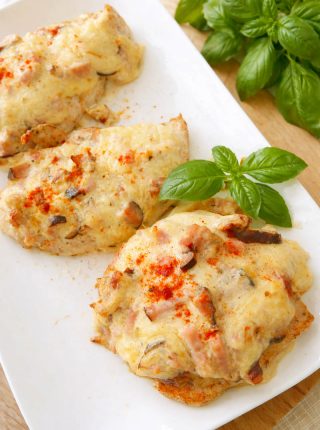 Piersi kurczaka pod pierzynką z serem, szynką i suszonymi pomidorami. Soczyste mięso, prosty przepis do piekarnika lub air...