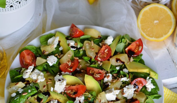 Kolorowa sałatka na bazie świeżych warzyw, niezwykle zdrowego awokado, delikatnie słodkiego ananasa oraz wyrazistego sera i chrupiącego słonecznika, polana aromatycznym octem balsamicznym to świetna propozycja drugiego śniadania czy lekkiej kolacji.