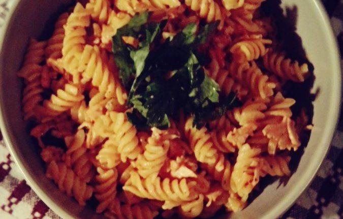 200 gramów makaronu -u mnie kokardki, sprawdzą się też rurki czy falbanki