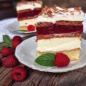 Klasycznego 3 bita u mnie na blogu do tej pory nie ma, mimo że robiłam to ciasto już kilka razy, ale jakoś nie było okazji go sfotografować. Za to dziś mam dla Was coś równie pysznego – 3 bita malinowego. To nic innego jak mięciutki biszkopt na którym spoczywa krem budyniowy, przykryty warstwą kakaowych herbatników, do tego galaretka z malinami i bita śmietana. Same pyszne warstwy, które nie tylko smakują genialnie ale i efektownie się prezentują.