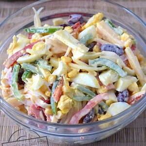 Nazwa sałatki oczywiście bierze się stąd, że wszystkie składniki kroimy w paseczki. Do tego dochodzi jeszcze kukurydza oraz fasolka.