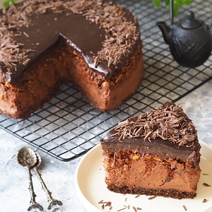 Czekoladowy sernik na zimno z musem z suszonych śliwek oraz czekoladową chrupką z płatków kukurydzianych. Pyszne ciasto bez pieczenia, przygotowane na spodzie herbatnikowym, z czekoladową masą serową z serka mascarpone i gorzkiej czekolady. Wierzch ciasta zdobi polewa z czekolady gorzkiej oraz mlecznej.