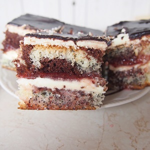 Zupełnie nie wiem czemu taka nazwa dla takiego pysznego ciasta. W zasadzie nie ma w nim nic nowego ani odkrywczego. Proste ciasto biszkoptowe z makiem i kakao, przełożone kremem budyniowym i dżemem do tego polane czekoladą, ale wszystkie smaki idealnie komponują się ze sobą i sprawiają, że ciasto smakuje fantastycznie.