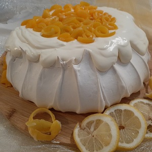 Beza Pavlova z kremem cytrynowym i brzoskwiniami