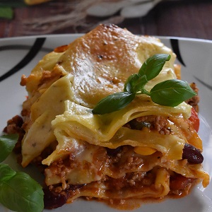 Inna niż wszystkie lazania, przekładana mięsem, różnym warzywami z dodatkiem sosu pomidorowego oraz beszamel. Zapiekankę pieczemy w piekarniku.