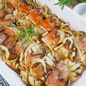 Biała kiełbasa zapiekana w piekarniku z boczkiem i cebulą