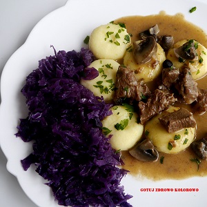 Gulasz podałam z kluskami śląskimi czerwoną kapustą.