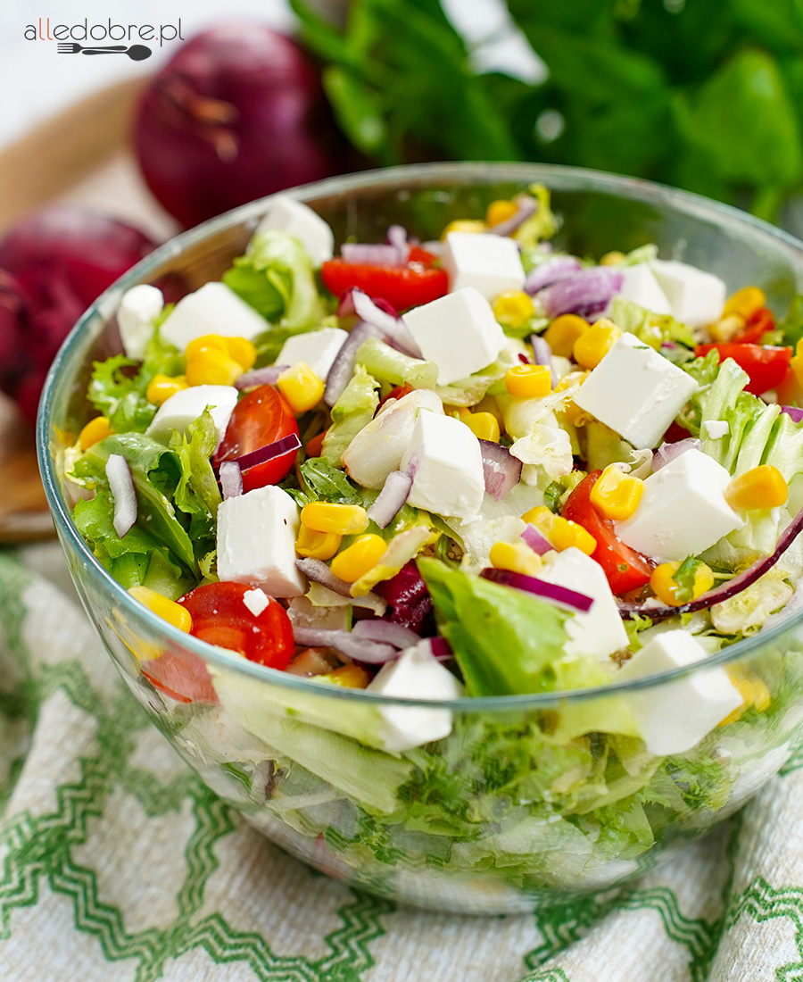 Połączenie świeżych warzyw ze słonym serem feta tworzy doskonałą harmonię smaków, a delikatnego sosu na bazie oliwy podkreśla całość. Sałatka jest pełna witamin i doskonała na każdą porę dnia i można ją przygotować w zaledwie kilka minut!