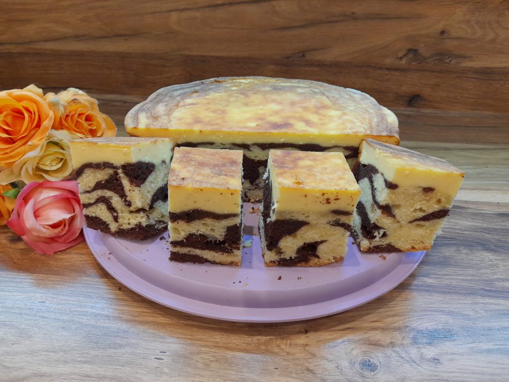 Dziś upiekłam ciasto, które jest trochę takim połączeniem dwóch wypieków:sernika i zebry. Zdecydowałam się na takie ciasto z dwóch powodów. Po pierwsze miałam za mało sera na zwykły sernik, z po drugie moja rodzina za bardzo nie lubi suchych ciast bez żadnych kremów i mas. Ciasto wyszło pyszne, następnym razem zdecydowanie muszę zwiększyć ilość składników