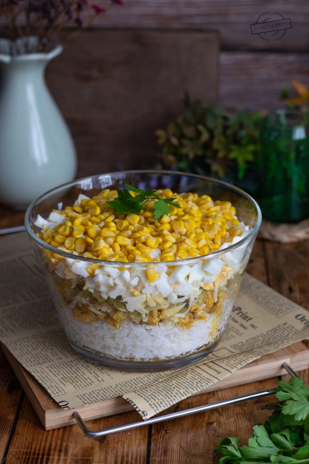 Sałatka warstwowa z ryżem, kurczakiem i jajkami