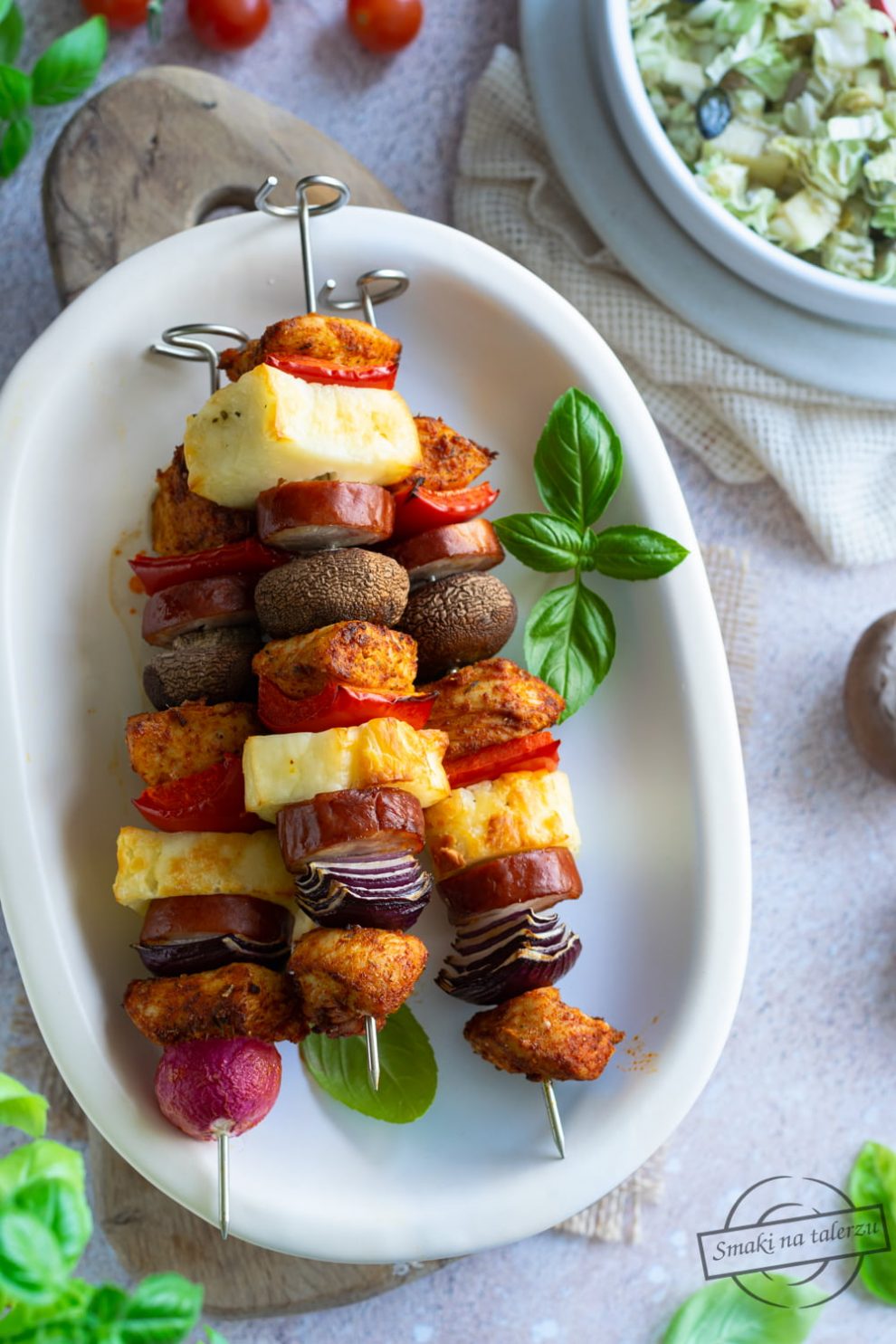 Szaszłyki z indykiem, kiełbasą i halloumi