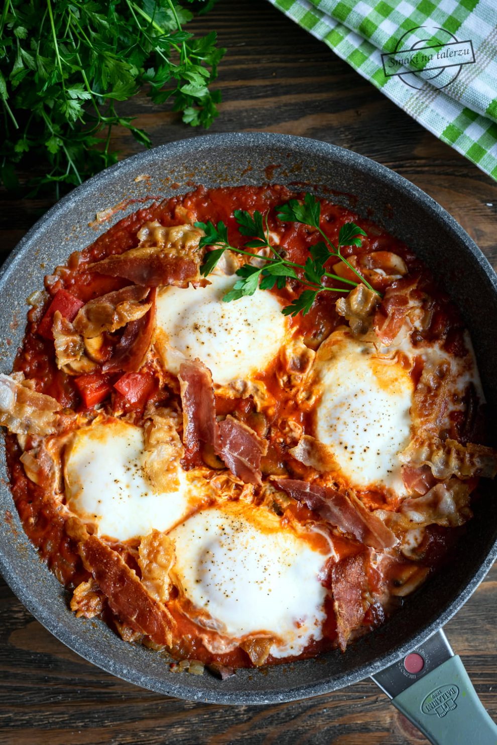 Szakszuka to bardzo fajna propozycja na wytrawne śniadanie. Ja uwielbiam śniadania na wytrawnie, zwłaszcza te z jajkami w roli głównej, i lubię też szakszukę w różnych wydaniach, ale… mam z nią mały „problem” 😉 Omlet z 2 jaj mnie nasyci, dwa jaja sadzone podane np z surowymi warzywami też. Ale 2 jaja sadzone w szakszuce…. no już niekoniecznie. Nie do końca rozumiem ten fenomen, ale tak już mam. Co pomaga? W tym wypadku np kromka chleba 😉