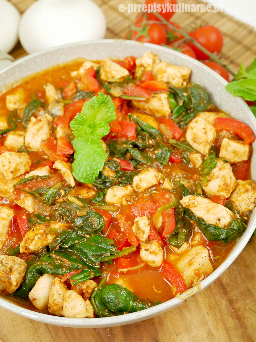 Kurczak ze szpinakiem w pomidorowym sosie to idealne rozwiązanie na smaczny i zdrowy obiad, który przygotujesz w mgnieniu oka! Soczyste kawałki kurczaka duszone w aromatycznym sosie pomidorowym z dodatkiem świeżego szpinaku i papryki to prawdziwa uczta dla podniebienia. Świetnie sprawdzi się na co dzień, ale spokojnie możesz go też podać gościom na eleganckim obiedzie. Przygotowanie jest proste i nie zajmie Ci nie więcej niż 30 minut!