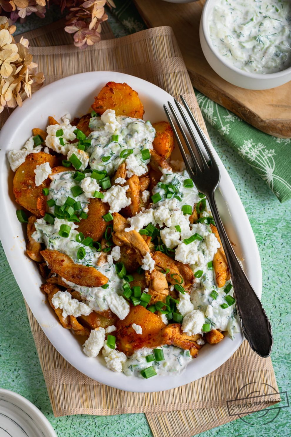Dziś propozycja na coś prostego i pysznego, czyli pieczone ziemniaczki z udkami kurczaka oraz tzatzikami posypane pokruszonym serem feta. Całość nie jest skomplikowana, wystarczą podstawowe składniki i dobra organizacja, by wszystkie składniki gotowe były w tym samym czasie.