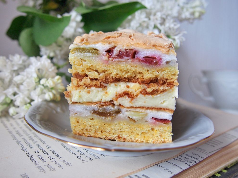 Zapraszam na pyszne ciasto z rabarbarem inspirowane popularną Panią Walewską, na którego widok ślinianki zaczynają intensywniej pracować. Mamy tutaj kruche blaty z dodatkiem kwaskowatego rabarbaru oraz słodkiej bezy z chrupiącymi płatkami migdałów, połączone kremem budyniowym. Niby nic wyszukanego ale smakuje jak idealny wiosenny deser.