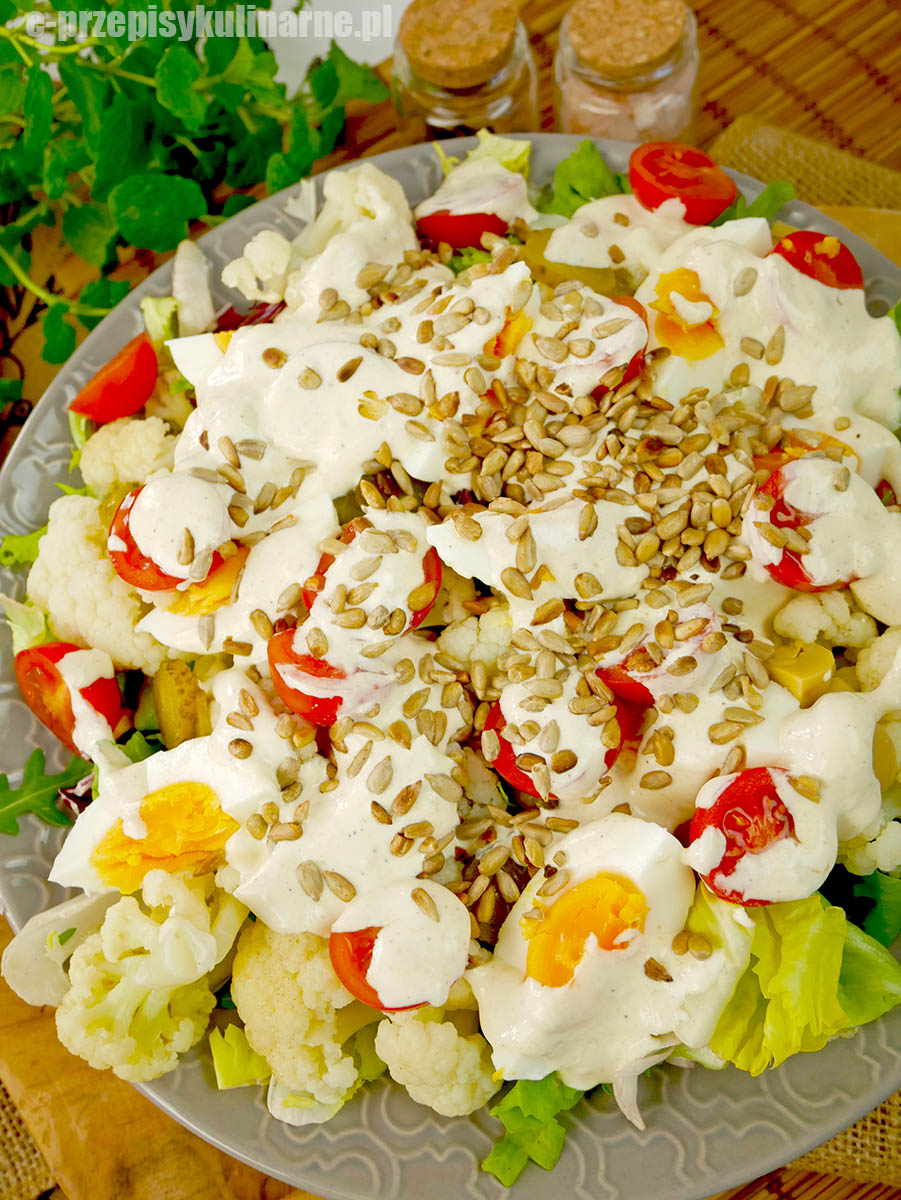 Szukasz ciekawej i niebanalnej propozycji na sałatkę, która sprawdzi się zarówno jako lekka kolacja, przekąska na imprezę, jak i dodatek do dań z grilla? Ta sałatka z kalafiorem i sosem musztardowym to idealny wybór! Jest kolorowa, pełna smaku i przyjemnie chrupiąca dzięki prażonym ziarnom słonecznika. Połączenie delikatnie ugotowanego kalafiora, jajek na twardo, świeżych pomidorków koktajlowych i wyrazistych dodatków, takich jak korniszony czy marynowane pieczarki, tworzy wyjątkowo udaną kompozycję.