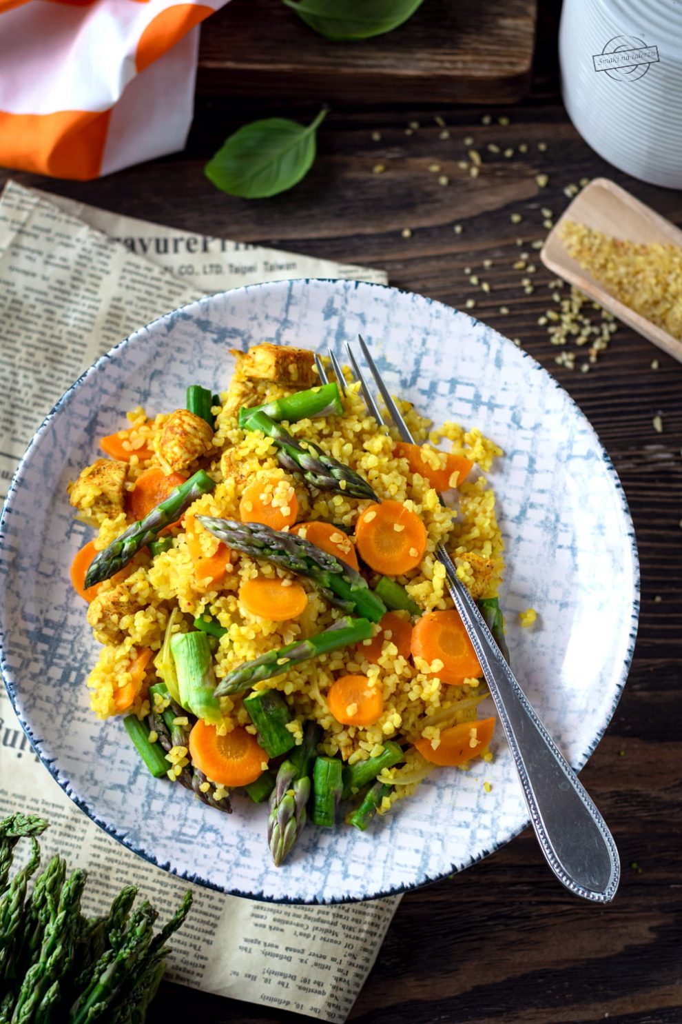 Przed Tobą kolejna pyszna i kolorowa propozycja na szybki, domowy obiad – tym razem z kaszą bulgur, kurczakiem, szparagami i marchewką. Całość przygotujesz na jednej patelni, bez zbędnego brudzenia naczyń.