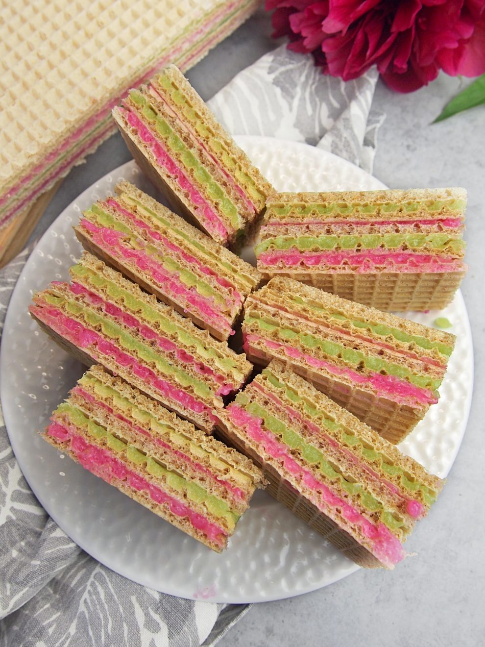 Moja córka jeszcze takich nie próbowała dlatego specjalnie dla niej przygotowałam wersję dwukolorową, chociaż kiedy usłyszała co robię zażyczyła sobie żeby każda warstwa miała inny kolor. To jak najbardziej jest do zrobienia, ale zdecydowanie wygodniej byłoby podwoić liczbę składników i przygotować 2 porcje wafli więc może innym razem.
