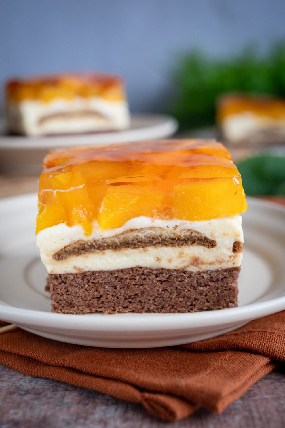 Jeżeli lubisz kawowe nuty w deserach oraz lekkie, owocowe warstwy – Słodka Pokusa z brzoskwiniami i kremem budyniowym będzie idealnym wyborem również dla Ciebie. To efektowne ciasto na biszkopcie kakaowym, przełożone delikatnym kremem budyniowym, z warstwą nasączonych w kawie biszkoptów, soczystych brzoskwiń i brzoskwiniowej galaretki.