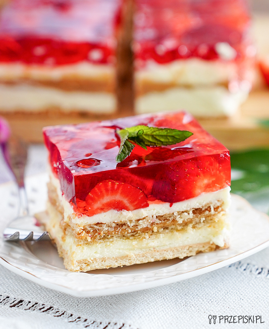 To pyszne, warstwowe ciasto na zimno, które zachwyca nie tylko swoim smakiem, ale i pięknie prezentuje się na stole. Bazą są maślane herbatniki, puszysta masa budyniowa, słone krakersy, słodka masa krówkowa oraz lekka galaretka z dodatkiem świeżych, soczystych truskawek.