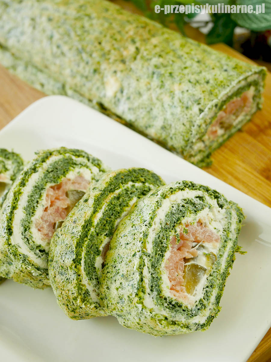 Rolada szpinakowa z łososiem to efektowna i jednocześnie bardzo prosta w przygotowaniu przekąska, która świetnie sprawdzi się na różnego rodzaju przyjęciach, świętach czy domowych uroczystościach. Połączenie delikatnego, wilgotnego szpinakowego biszkoptu z kremowym serkiem i wędzonym łososiem smakuje wyśmienicie i pięknie prezentuje się na stole. Dzięki ogórkom konserwowym danie zyskuje przyjemną chrupkość i lekką kwaskowatość, która idealnie balansuje całość.