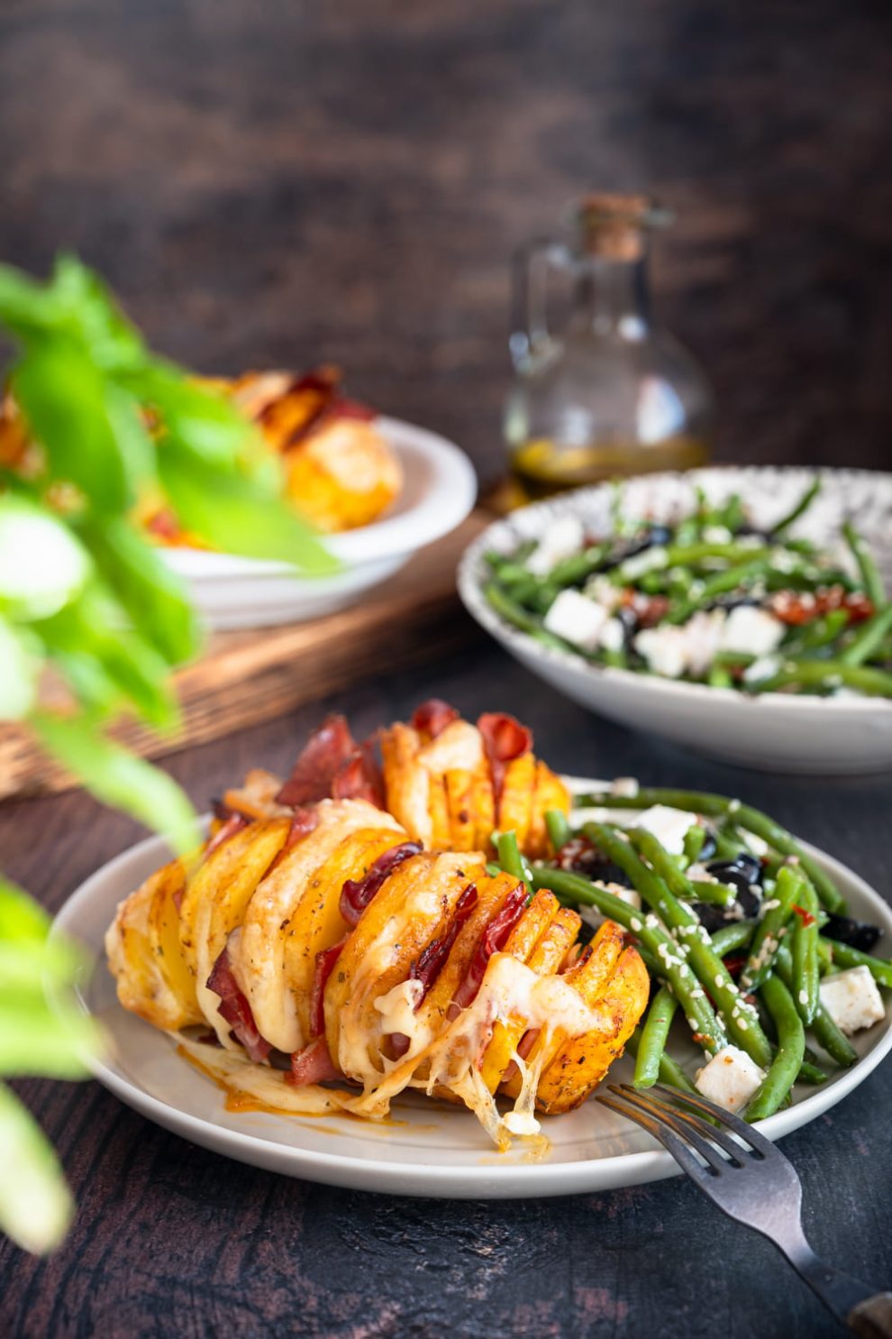 Ziemniaki Hasselback z nadzieniem to pyszna i oryginalna alternatywa dla klasycznych ziemniaków pieczonych czy ziemniaków Hsselback bez nadzienia. W tej wersji wykorzystałam szynkę szwarcwaldzką oraz roladę ustrzycką. Składniki te nadały daniu intensywnego, wyrazistego smaku. Ziemniaki kroiłam na nieco grubsze plastry, aby z łatwością włożyć pomiędzy nie plasterki sera i wędliny.