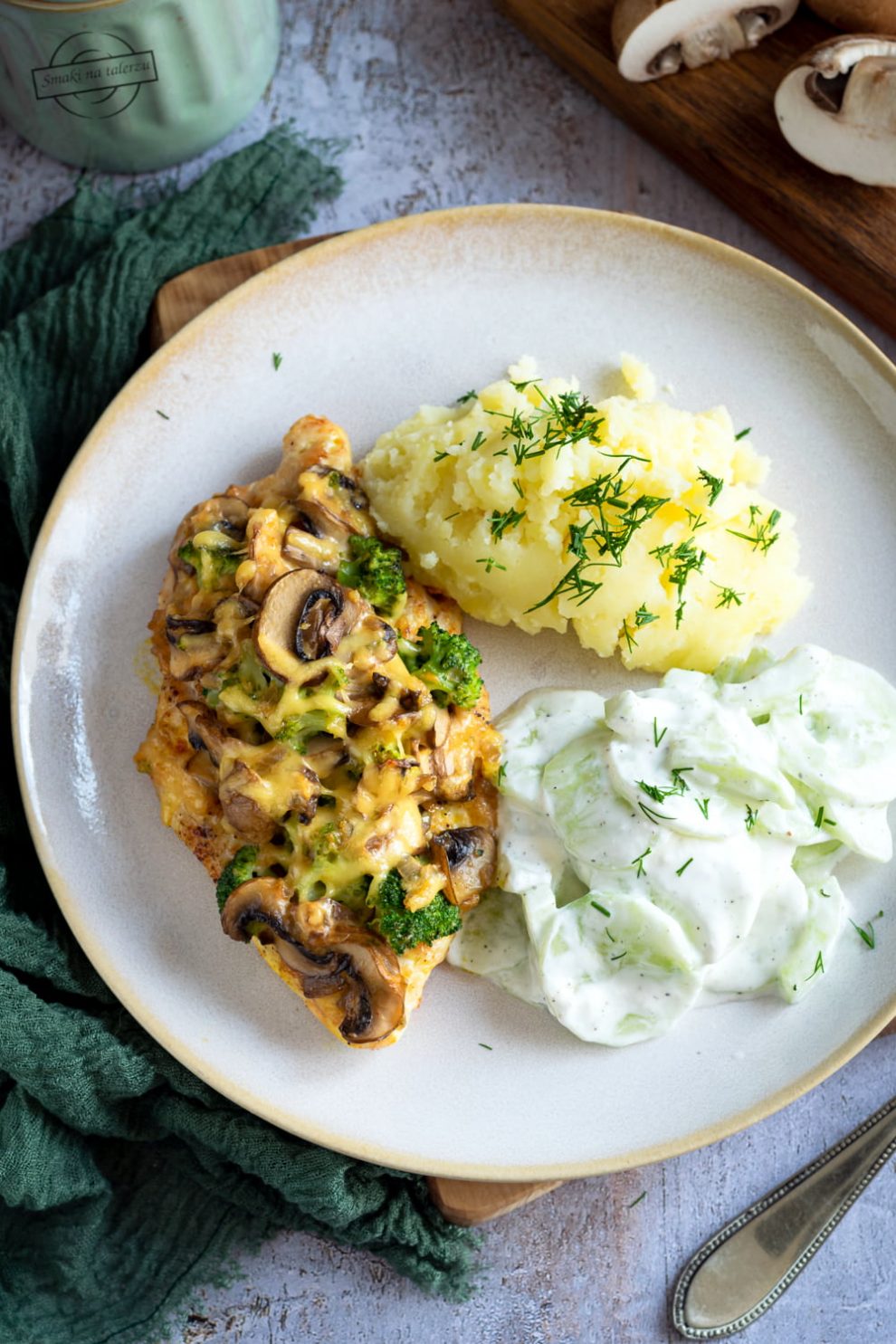 Piersi kurczaka z pieczarkami, brokułem i serem