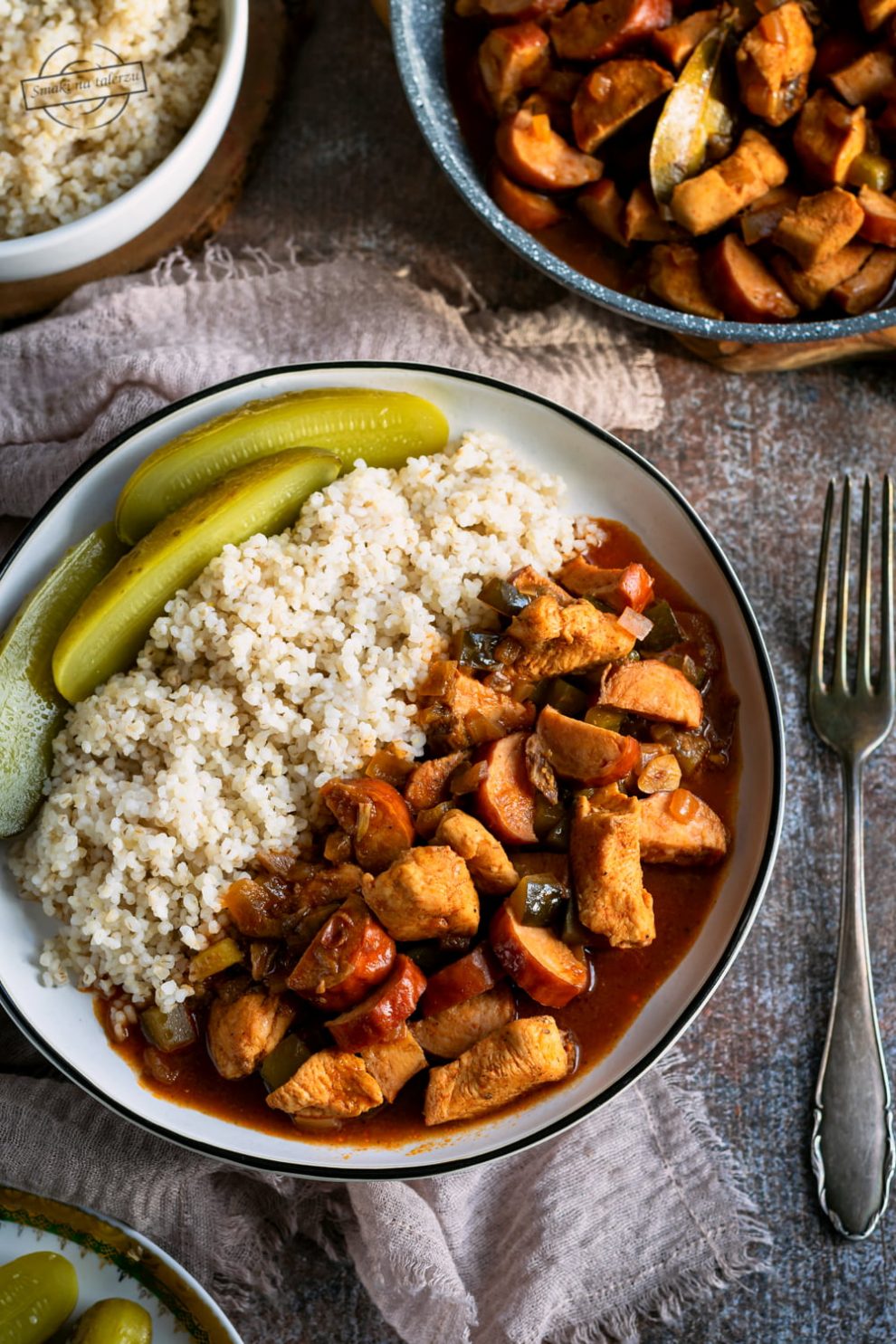 W tym przepisie ważną rolę odgrywa odpowiednie przygotowanie składników oraz kolejność ich smażenia i duszenia. Dzięki temu mięso pozostaje soczyste, kiełbasa oddaje swój lekko wędzony aromat, a grzyby nadają potrawie charakterystycznej głębi. Kwaśny akcent ogórków kiszonych przełamuje delikatną słodycz cebuli i koncentratu pomidorowego, tworząc harmonijną całość. Gulasz drobiowy z kiełbasą i grzybami świetnie komponuje się z kaszą, ryżem lub ziemniakami, dlatego z łatwością dopasujesz go do codziennego menu.