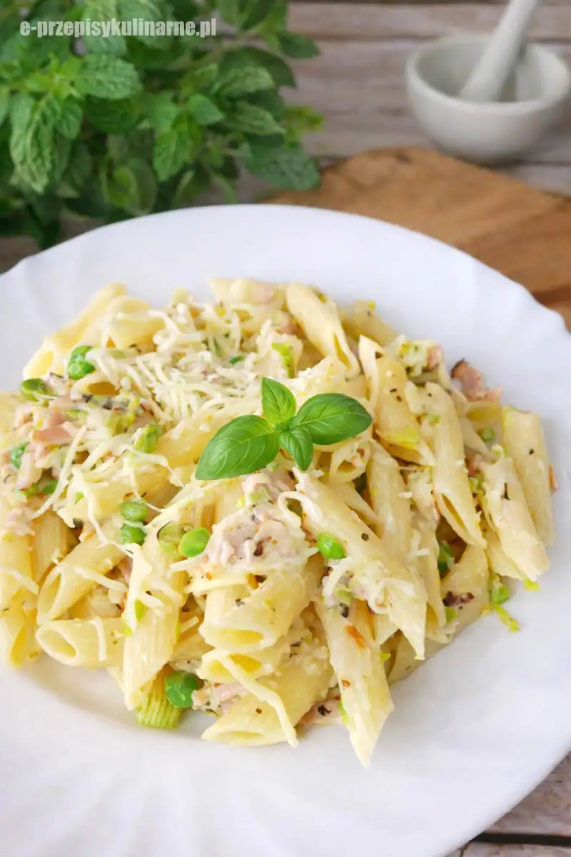 Szybki makaron na obiad to jedno z tych dań, które naprawdę ratują dzień, kiedy nie ma czasu na długie gotowanie. Wystarczy kilka podstawowych składników, żeby przygotować sycący, kremowy i domowy posiłek dla całej rodziny. Ten przepis sprawdza się zarówno w tygodniu, jak i wtedy, gdy trzeba wykorzystać produkty, które akurat są w lodówce. Połączenie pora, szynki, groszku i sera daje prosty, ale bardzo udany efekt.
